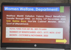 सशक्त उत्तराखंड, देहरादून। महिला सशक्तिकरण एवं बाल विकास मंत्री रेखा आर्या ने मुख्यमंत्री वात्सल्य योजना के तहत लाभार्थियों को 3 करोड़ 9 लाख रुपए से ज्यादा की धनराशि जारी की।